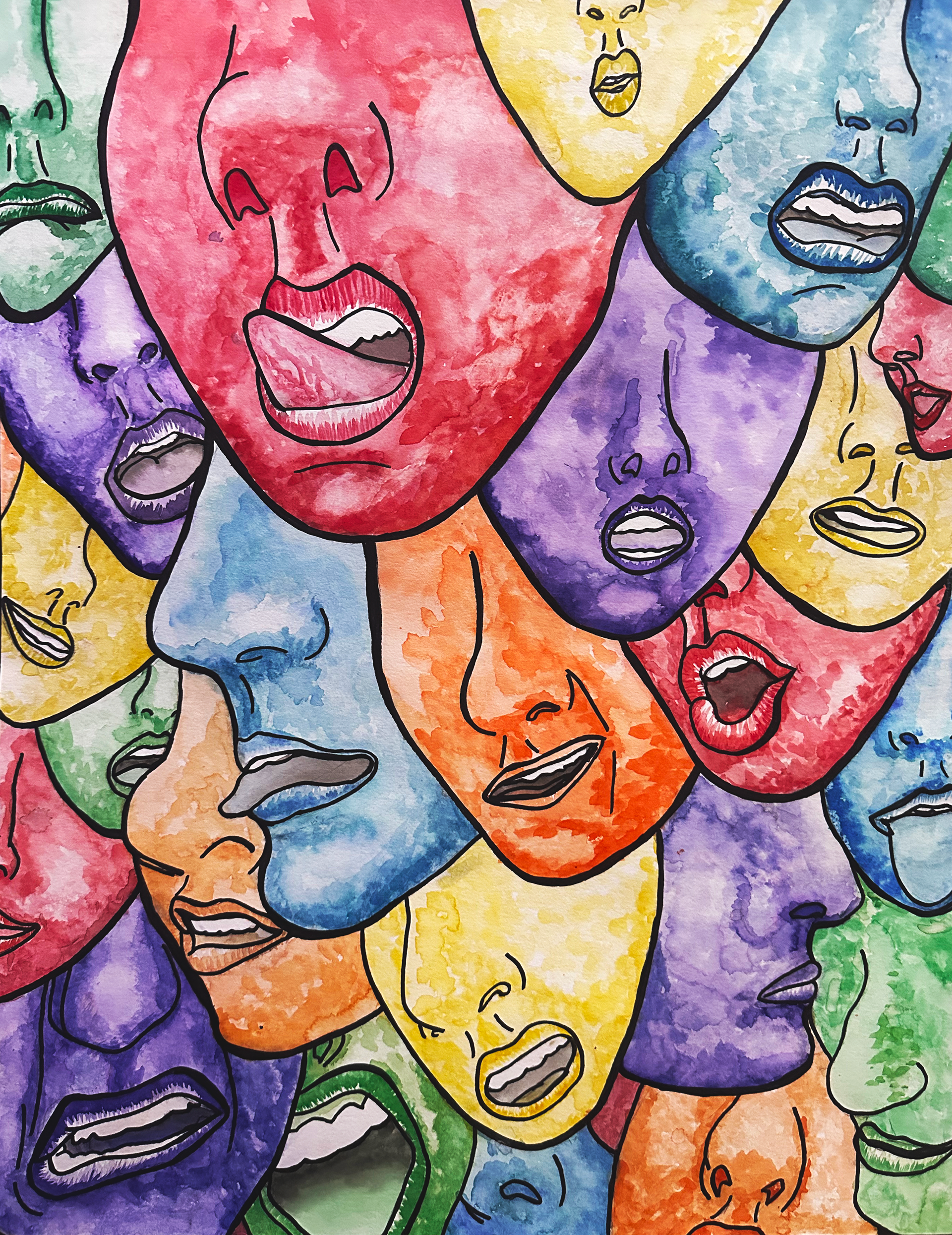 A traditional artwork created with watercolor and maker on a 21" by 17.5" canvas. This piece pairs layered texture and vibrant color with bold line work to define structure and amplify its intensity.